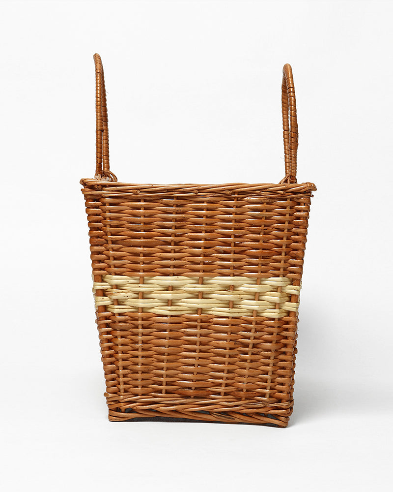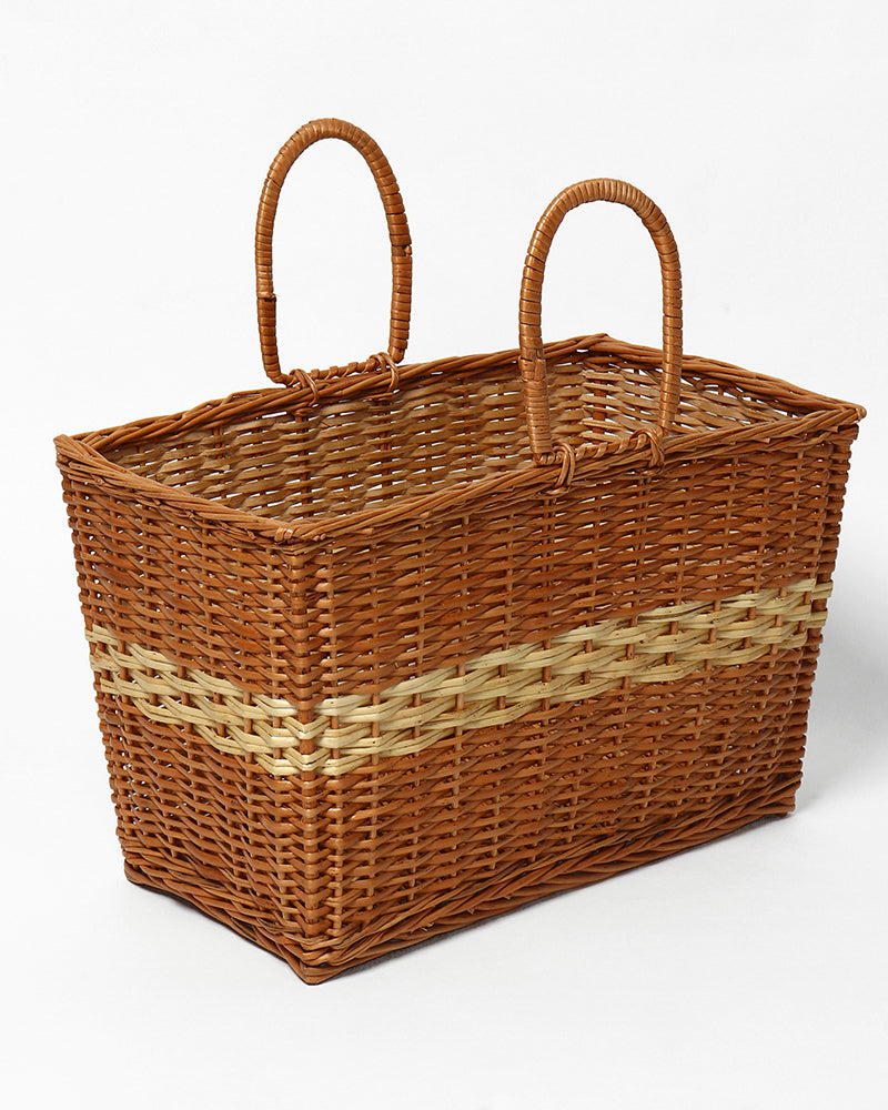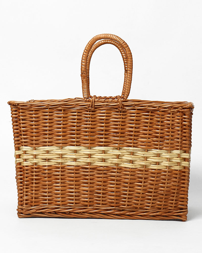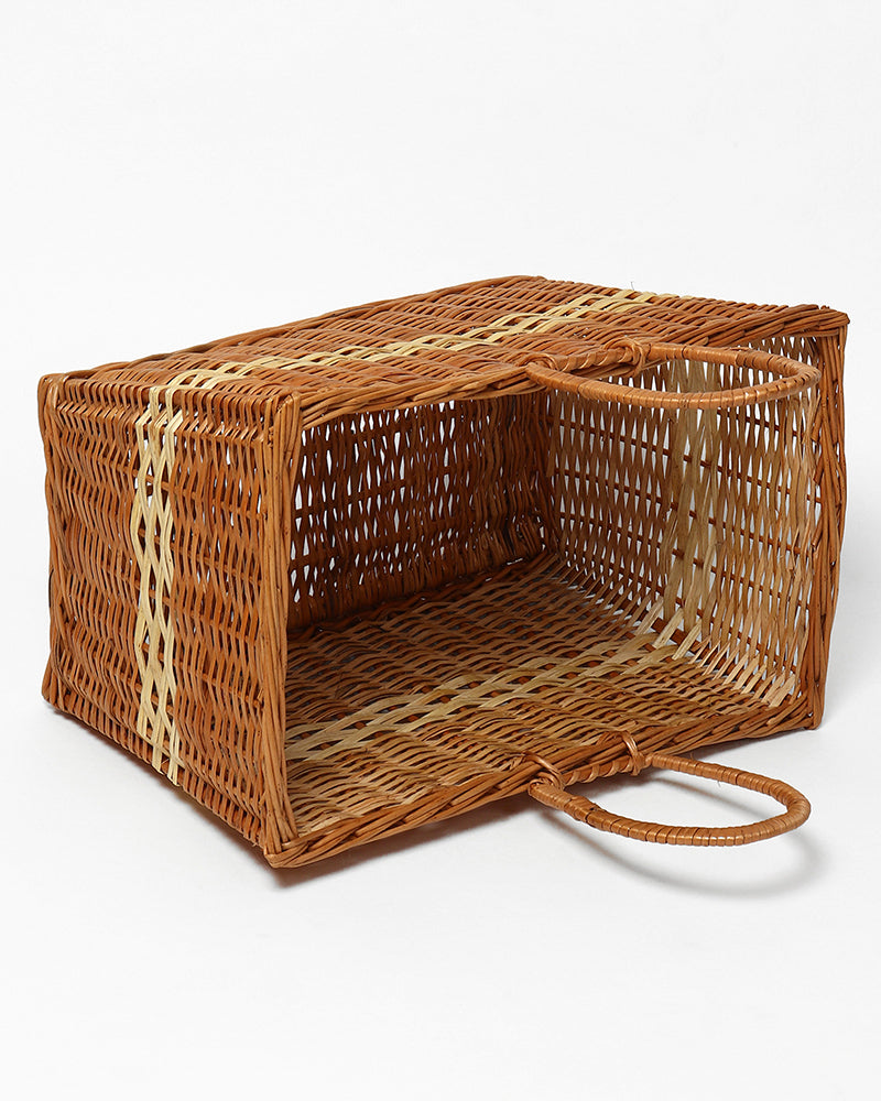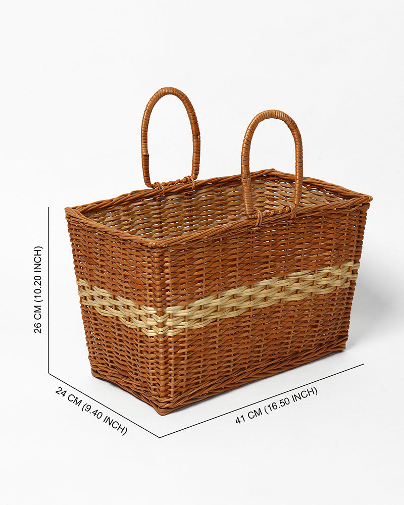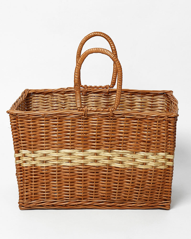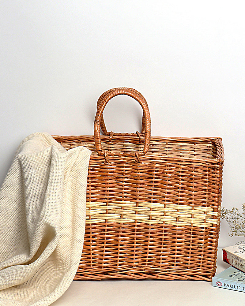 Dekorative, funktionale und leichte handgefertigte Tragetasche aus Weidengeflecht mit strukturiertem und modernem Design mit Griffen für einfachen Transport.