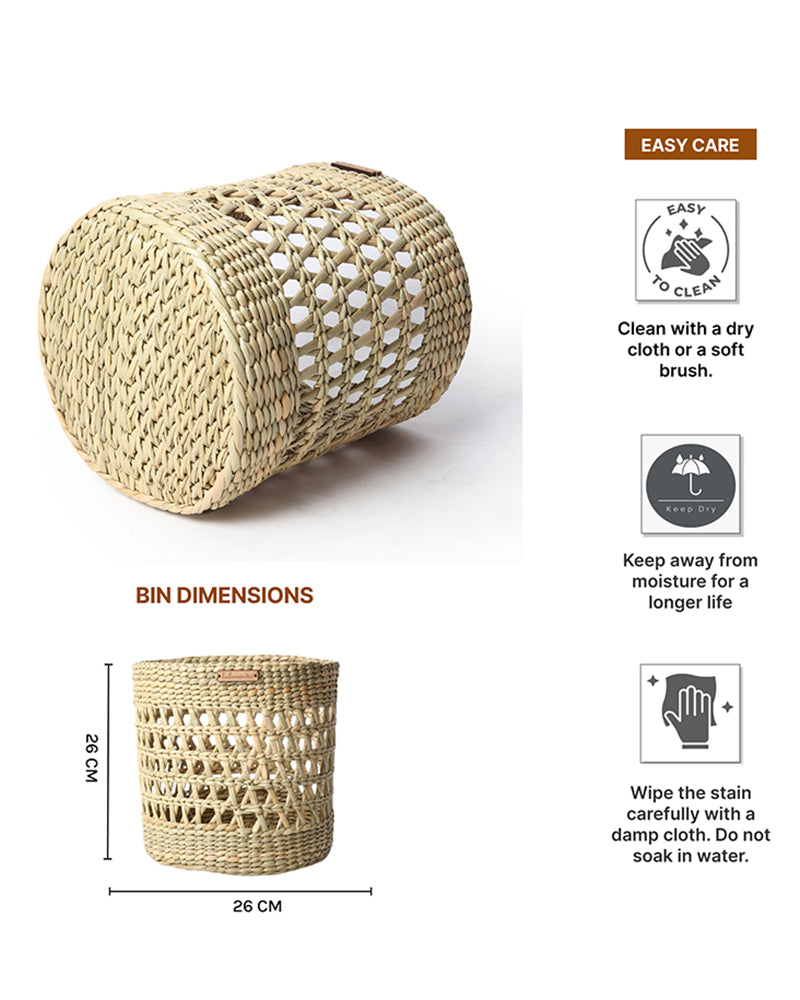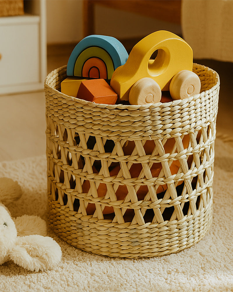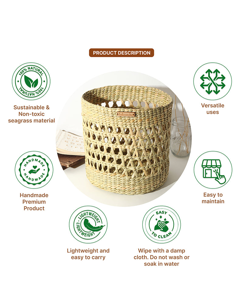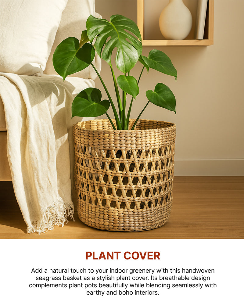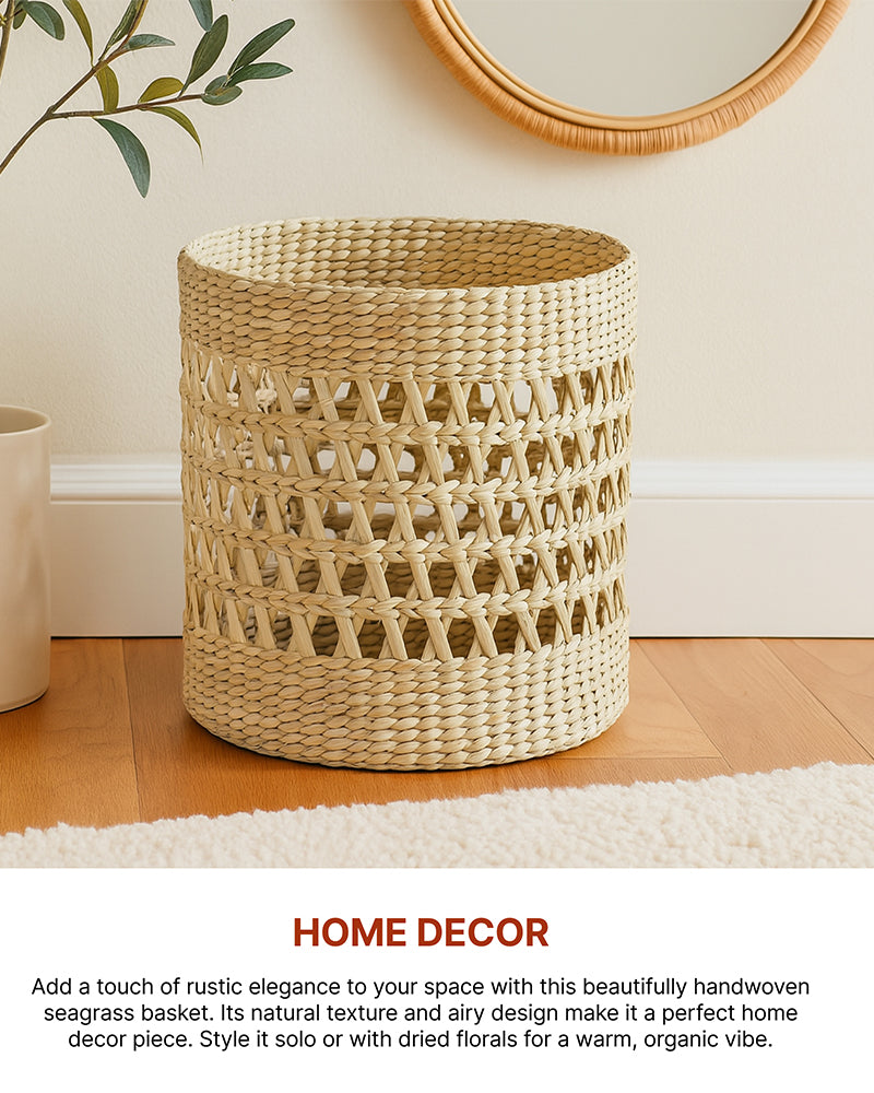 Multi-purpose lightweight hand-woven seagrass shelf basket with handles for easy portability.