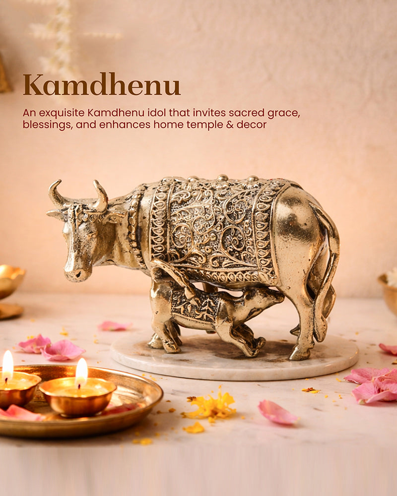 Invite peace, prosperity, and positive energy into your home with this beautifully crafted Kamdhenu cow with calf idol Known as the sacred wish-fulfilling cow in Hindu tradition, Kamdhenu symbolizes abundance, harmony, and divine blessings.