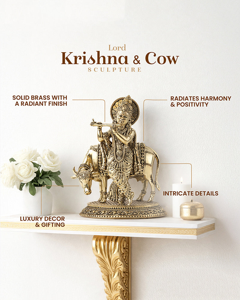 Handcrafted Krishna ji with Cow Brass Idol designed to embody courage, wisdom, and divine protection within your sacred space.