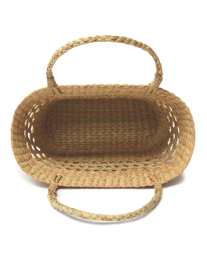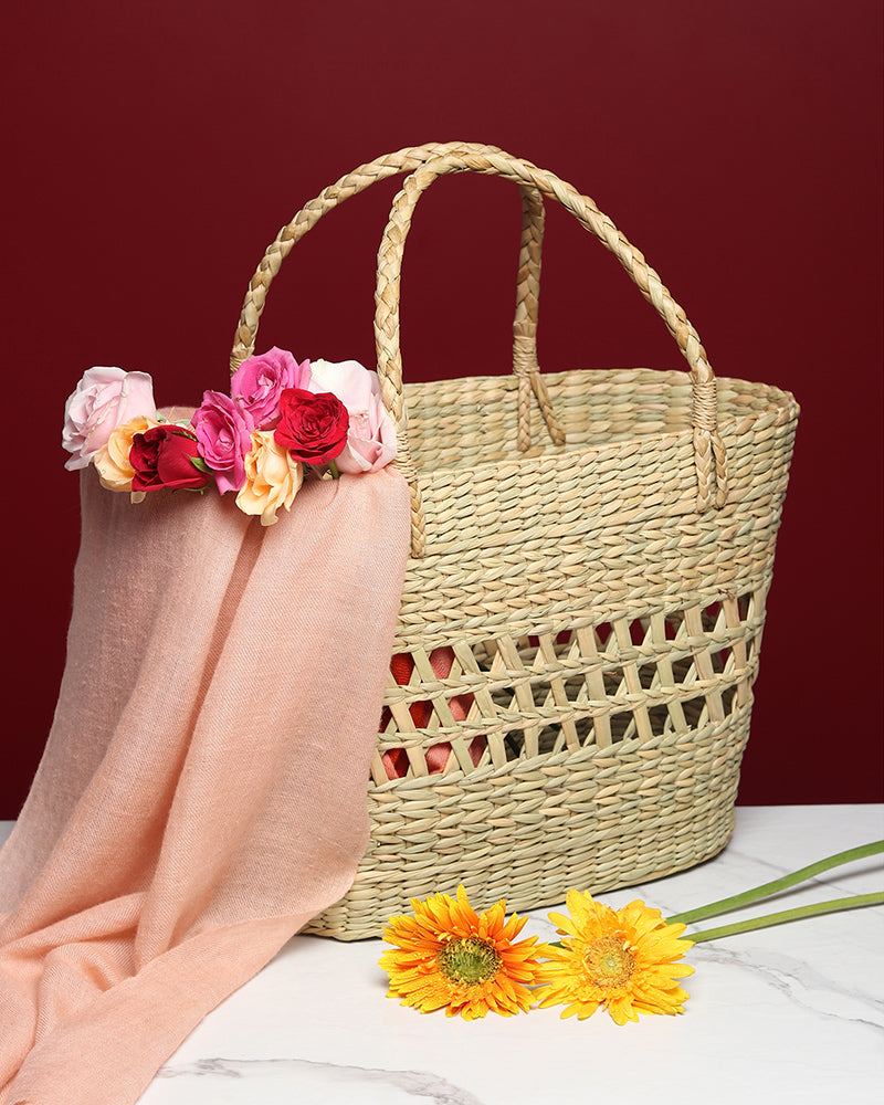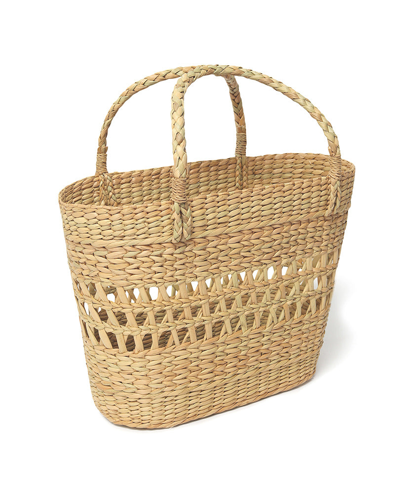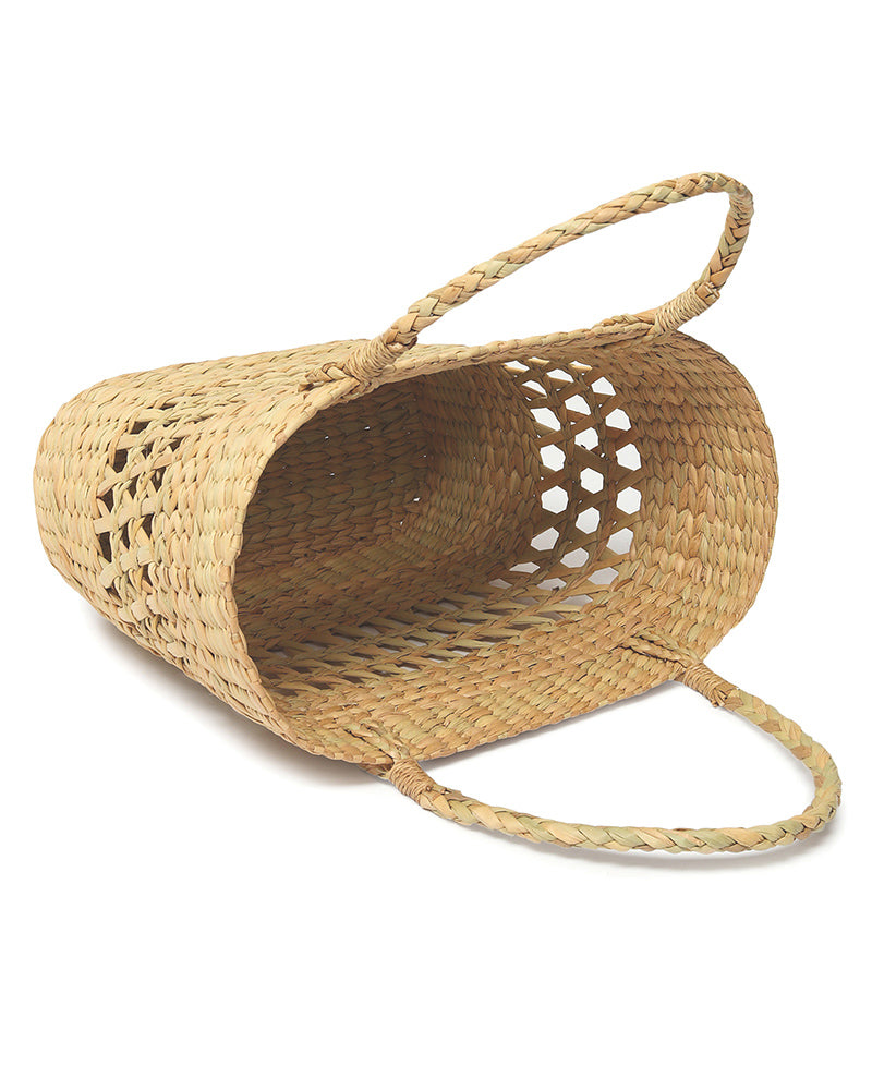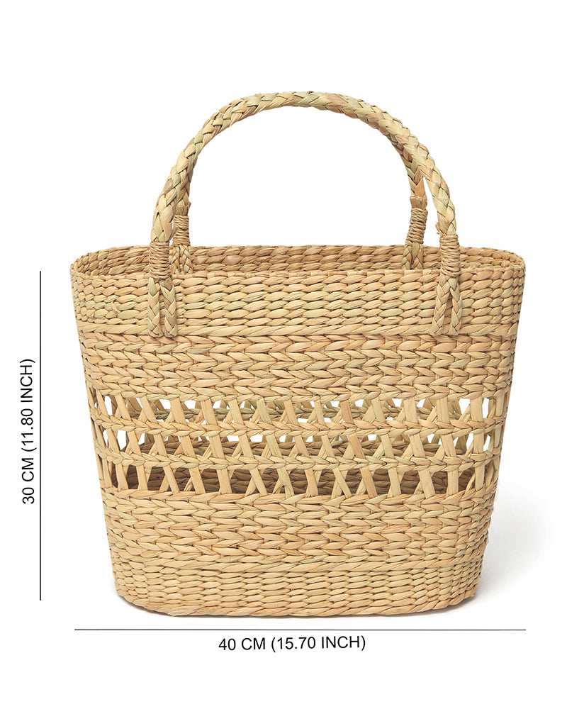 Decorative, functional and lightweight hand-braided seagrass tote bag with structured and modern design with handles for easy portability.