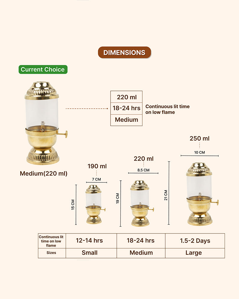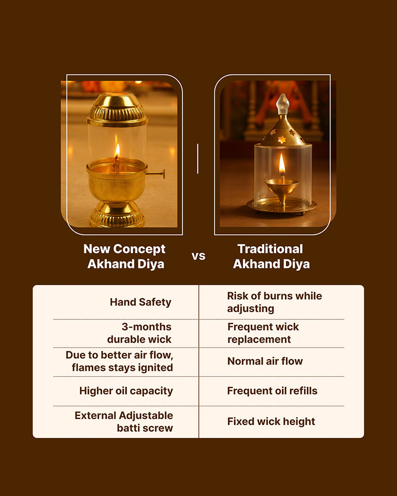 Illuminate your pooja space with our premium Akhand Diya, designed to hold an Akhand Jyot that burns steadily for hours.