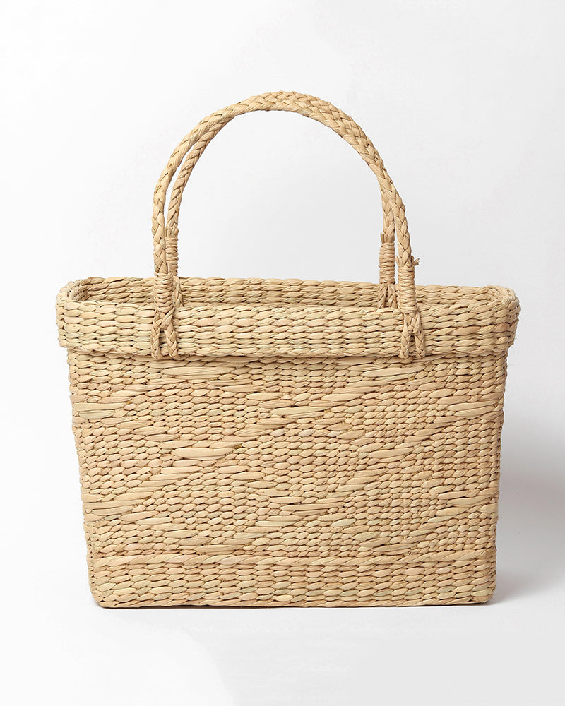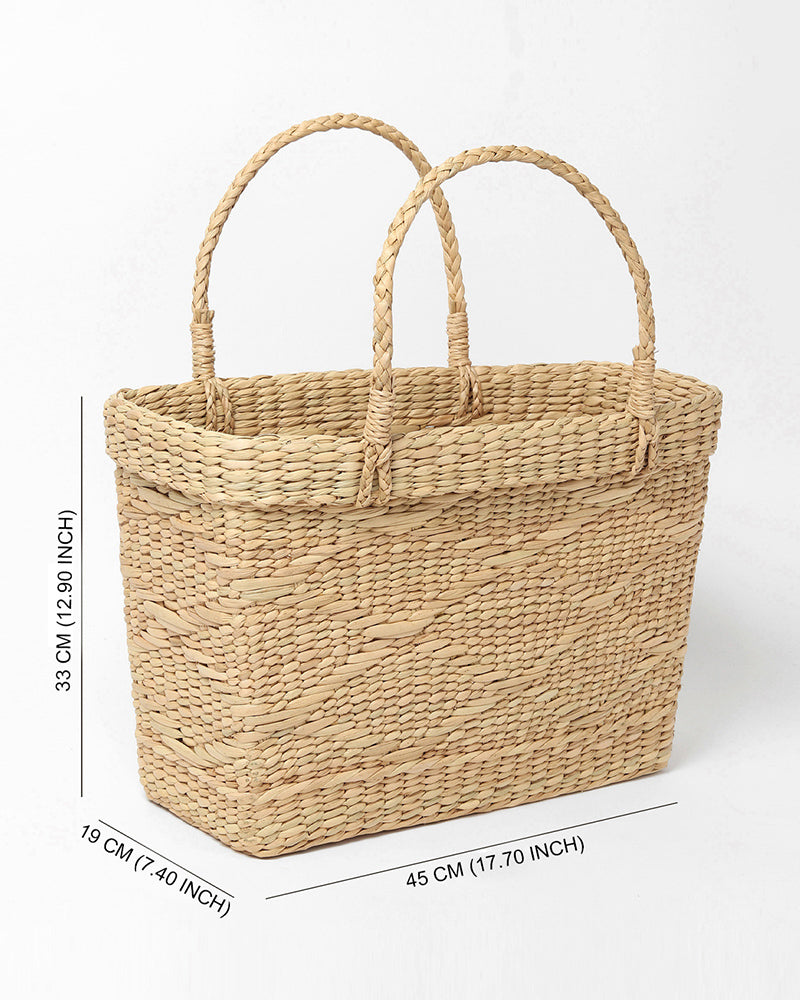 Decorative, functional and lightweight large seagrass tote bag with structured and modern design with handles for easy portability.