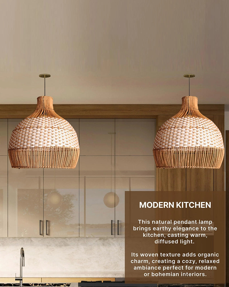 A modern interior decor bamboo pendant light that delivers an exquisite ambience of soft and welcoming light, thanks to its open weave design, giving your space a gentle and textured warmth.
