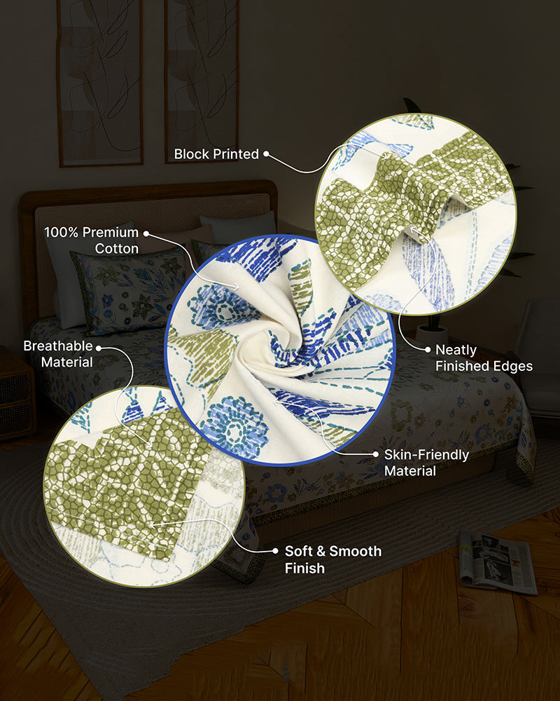 Jaipuri screen printed pure cotton bedsheet designed to bring timeless artistry and comfort to your bedroom décor.